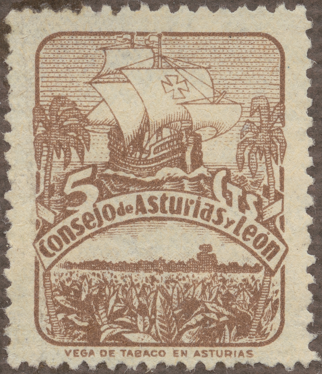 Frimärke från Asturias och Léon (Spanien), 1936. Motiv av Spansk Karavell, tobaksplantage.