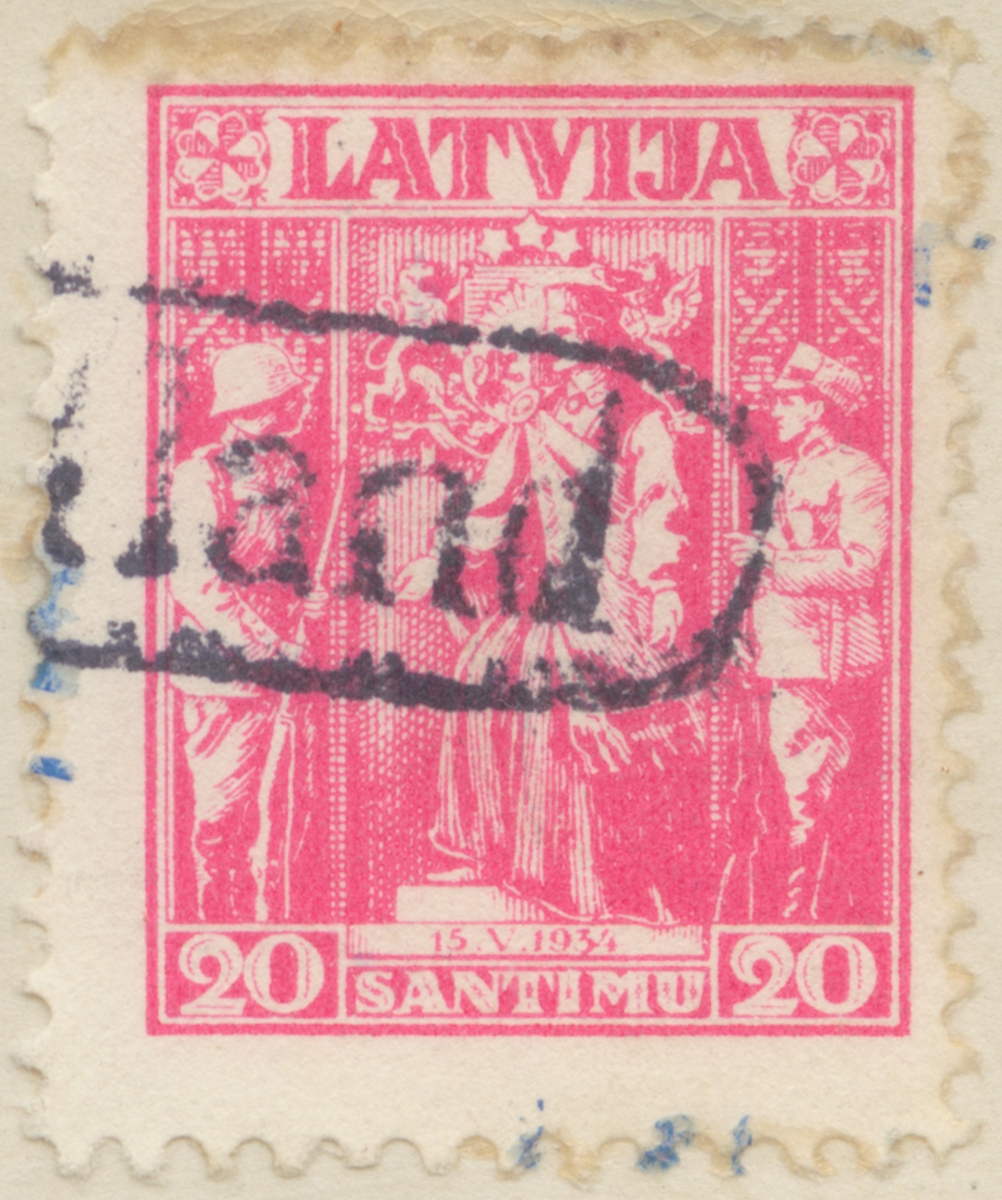 Frimärke från Lettland, 1934. Motiv av Allegoriska figurer: Symboler för Lettland.