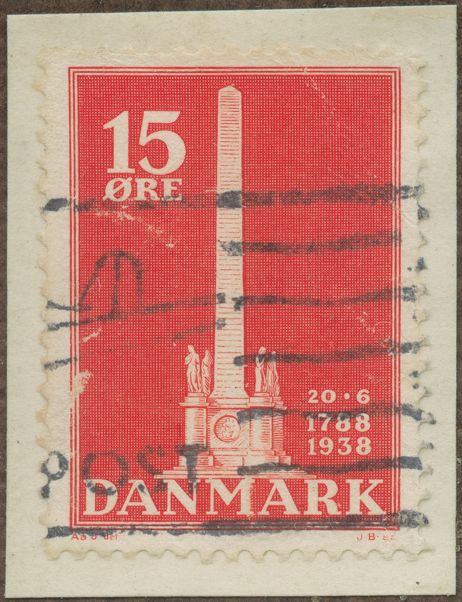Frimärke från Danmark, 1938. Motiv av 150-års Minnespelare: s.k. "Frihetsstötten" i Köpenhamn till minne av den danska bondestånds frigörelse från en form av livegenskap, s.k. "stavnsbaandet", den 20 juni 1788. -150-årsminne- 1788-1938.