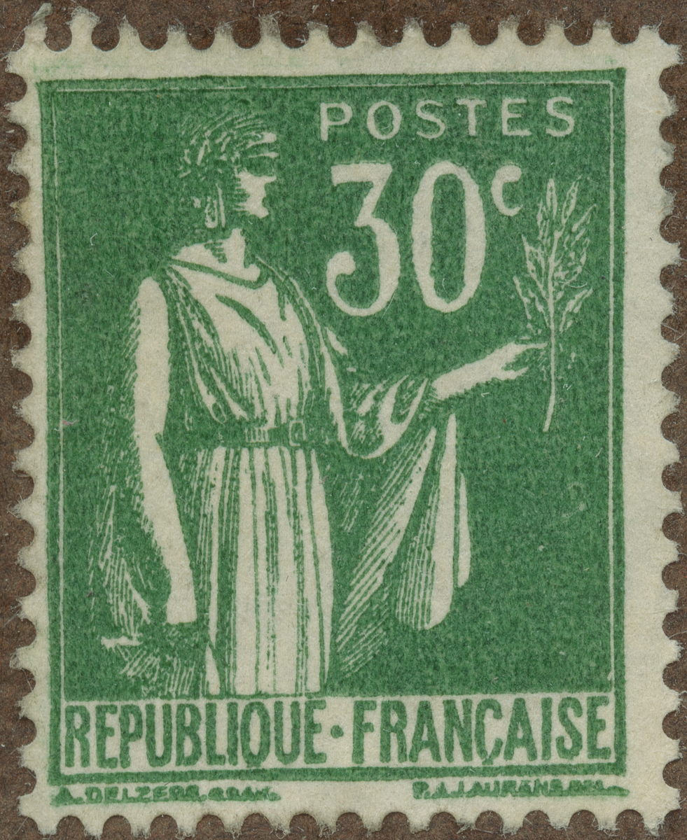 Frimärke från Frankrike, 1932. Motiv av Kvinna med fredspalm Symbol