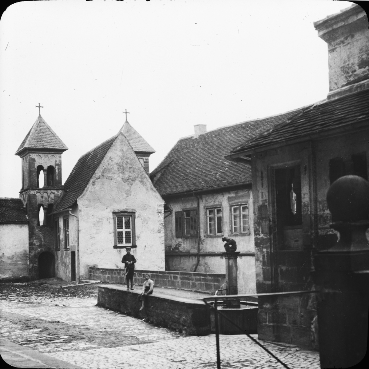 Skioptikonbild med motiv av två barn på gården vid Schloss Kronburg.