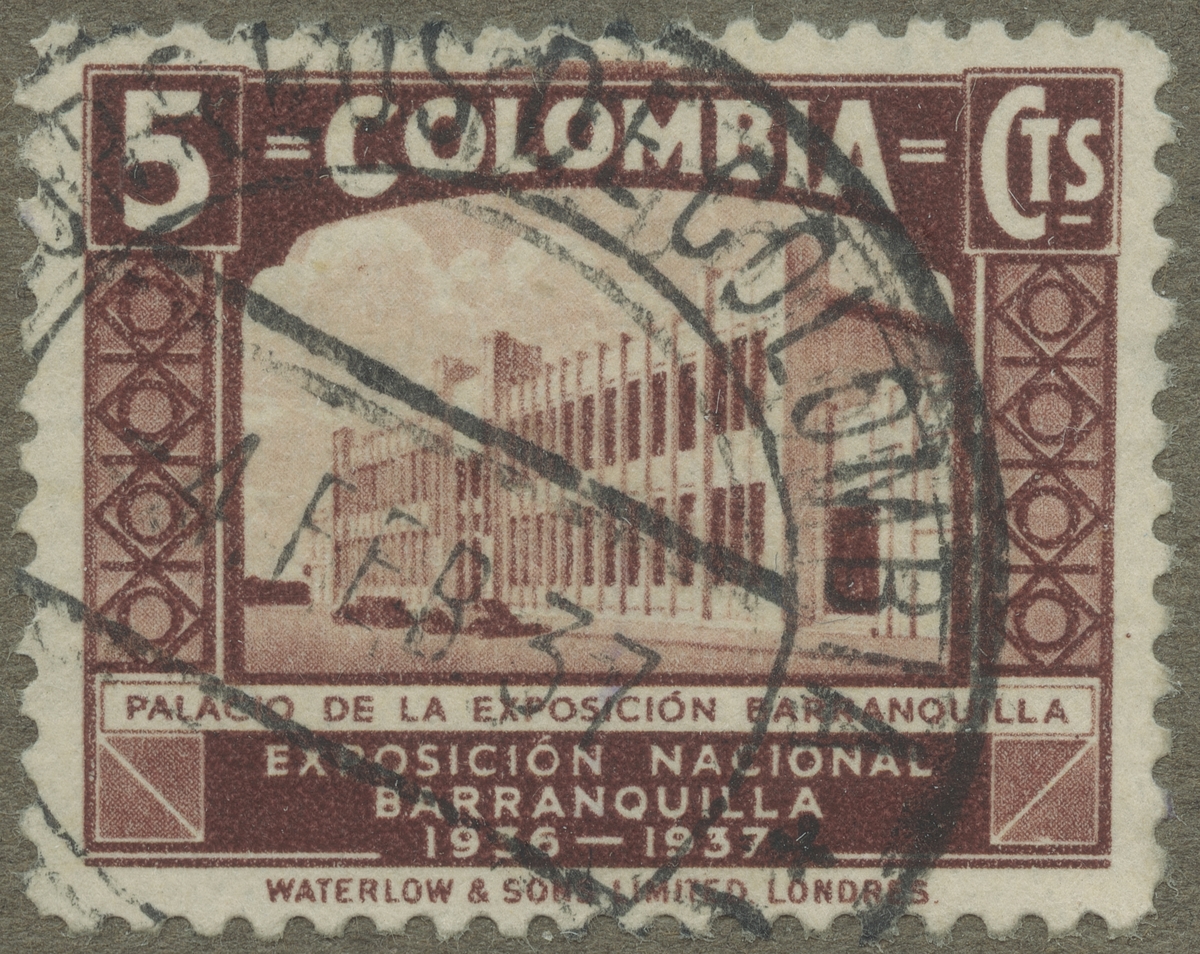 Frimärke från Colombia, Sydamerika, 1937. Motiv av Utställningspalatset vid industriutställningen i Barranquilla 1937.