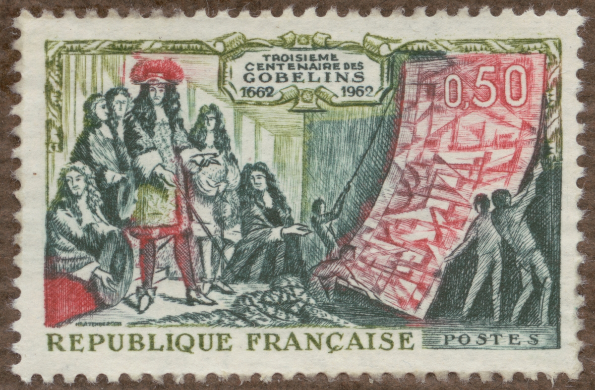 Frimärke från Frankrike, 1962. Motiv av Ludvig XIV som inspicerar ett fransk gobeläng. "300-års minne av fransk gobelängkonst - 1662-1962".