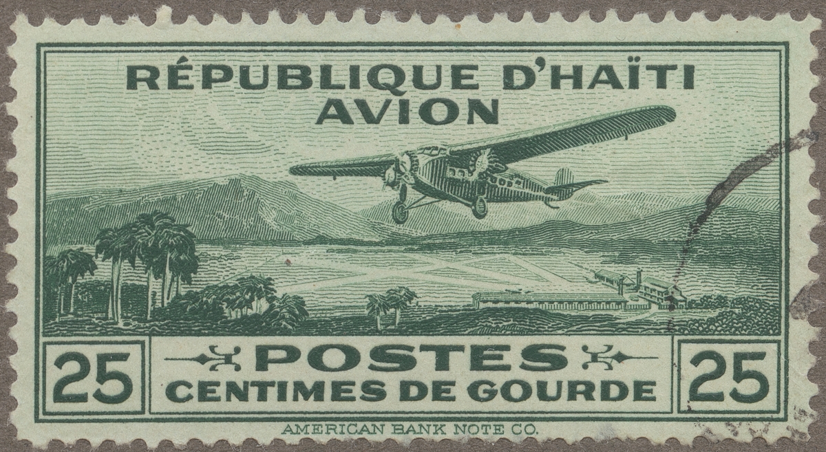 Frimärke från Haiti, 1930. Motiv av Tremotorigt monoplan över Port-au-Prince, Haitis huvudstad.