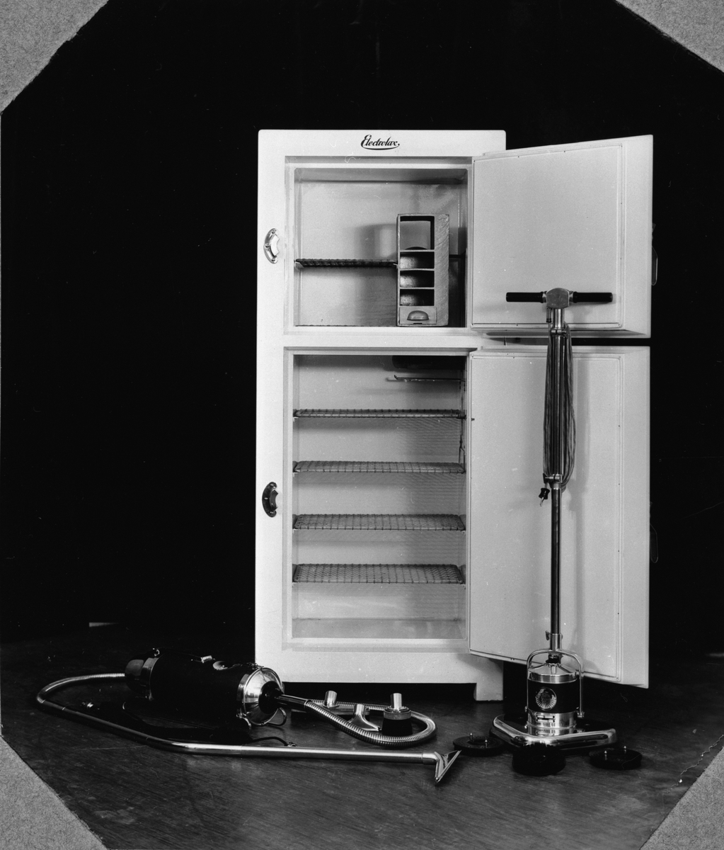 2 kylskåp i ett hölje, öppet. Dammsugare och apparat för att bona (polera) golv med.