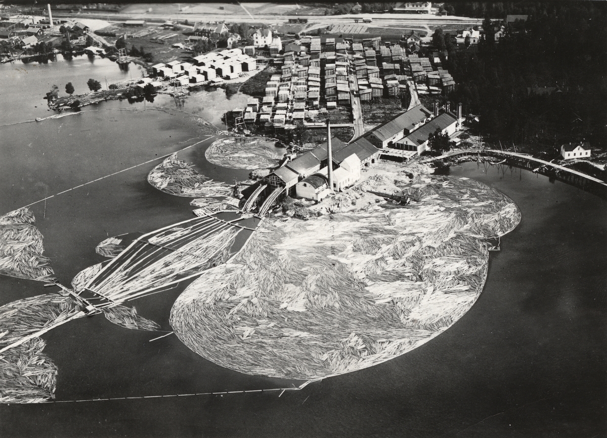 Flygfotografi över Skinnskattebergs sågverk, vilket senare kom att tillhöra AB Statens Skogsindustrier.