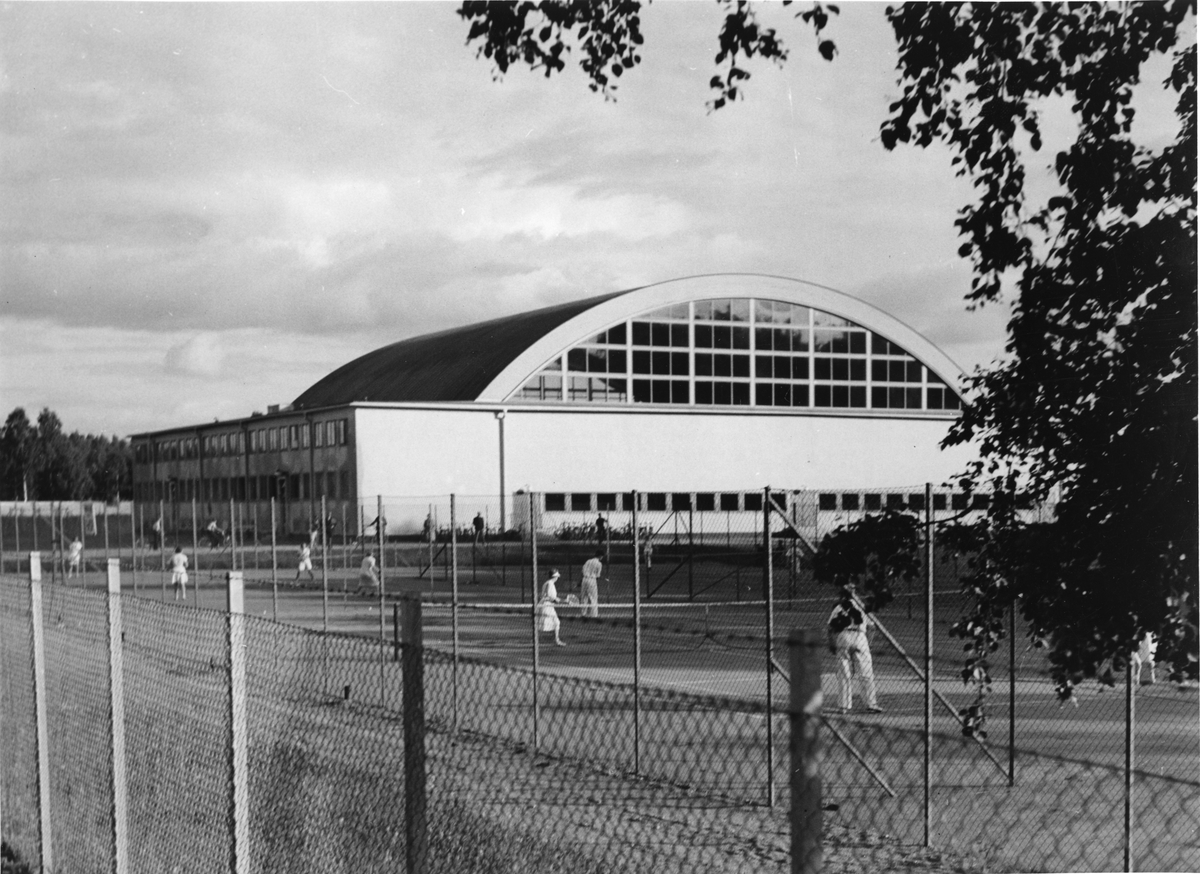 Sandvikens Järnverk (Sandvikens Jernverk). Jernvallens idrottshall med tennisbanor i förgrunden, omkring 1940.