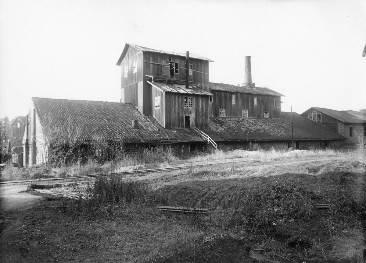 Hytta och rostugn i Borgvik, 1924. Sett norrifrån. Byggda 1863-1865. Hyttan nedblåstes för alltid 1922. Byggnaderna kvarstodo 1930.