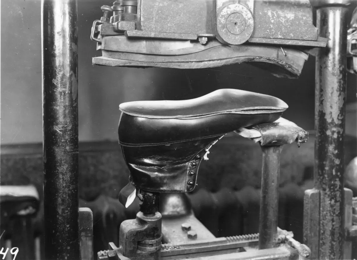 Svenska Skoindustri AB i Örebro. Slitsulan av kärnläder lägges på och pressas fast provisoriskt.