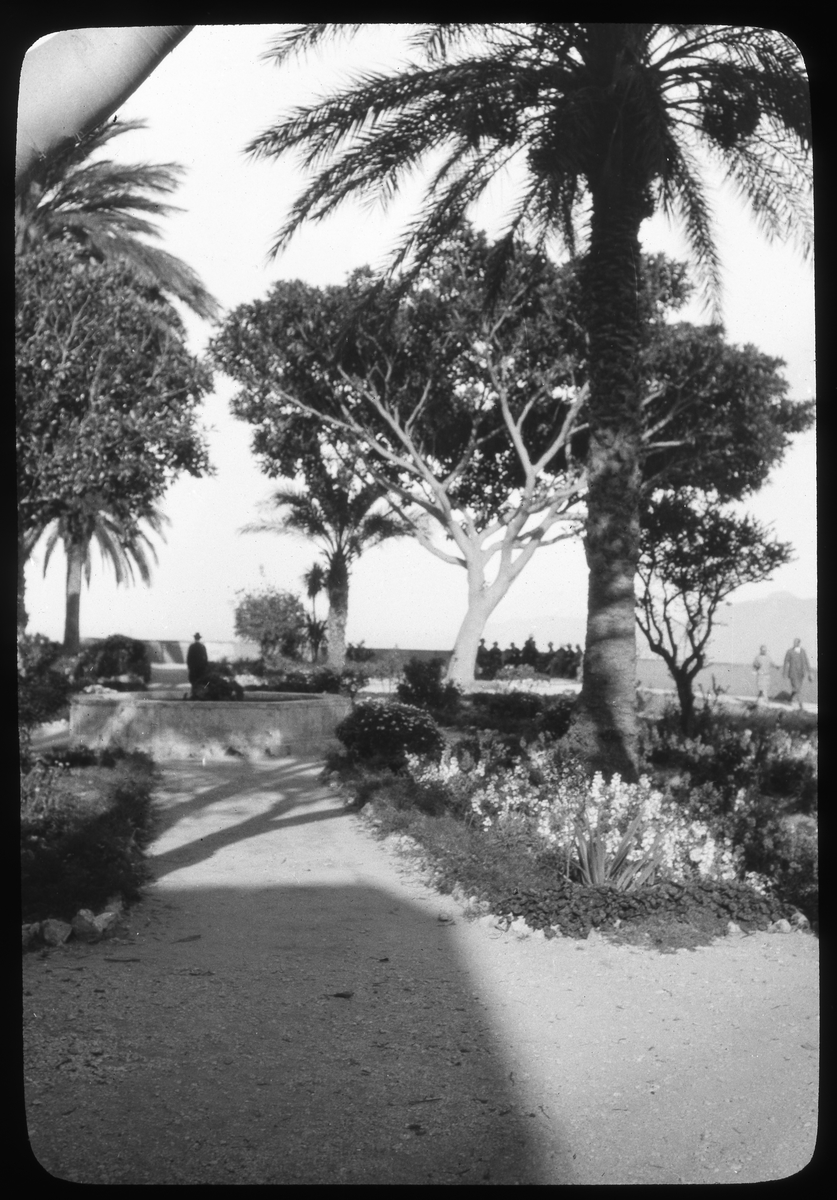 Skioptikonbild från institutionen för fotografi vid Kungliga Tekniska Högskolan. Bilden är troligen tagen av John Hertzberg under en resa i Europa. Hertzberg blev docent i fotografi 1921vid Kungliga Tekniska Högskolan i Stockholm. Park (troligen i södra Europa).