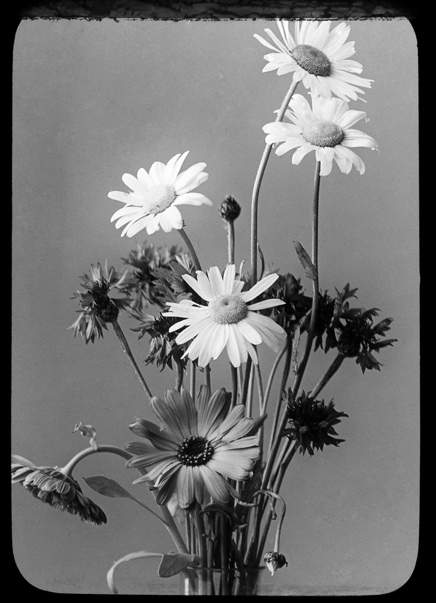 Skioptikonbild från institutionen för fotografi vid Kungliga Tekniska Högskolan. Använd av professor Helmer Bäckström som föreläsningsmaterial. Bäckström var Sveriges första professor i fotografi vid Kungliga Tekniska Högskolan i Stockholm 1948-1958. Motiv föreställande blommor i vas. På bilden står skrivet: Vanlig plåt.