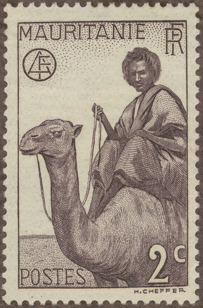 Frimärke ur Gösta Bodmans filatelistiska motivsamling, påbörjad 1950. Frimärke från Mauretanien, 1938. Motiv av Kamel som riddjur Afrika