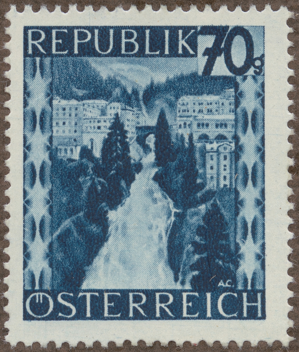 Frimärke ur Gösta Bodmans filatelistiska motivsamling, påbörjad 1950. Frimärke från Österrike, 1946. Motiv av Vattenfall i Bad-Gastein, Salzburg. Österrike