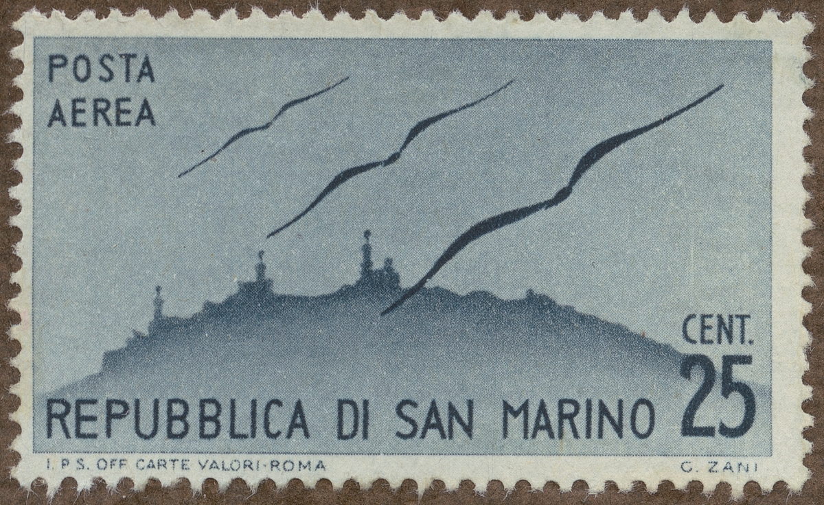 Frimärke från San Marino, 1946. Motiv av Flygsymbol Kontur av San Marinoklippan