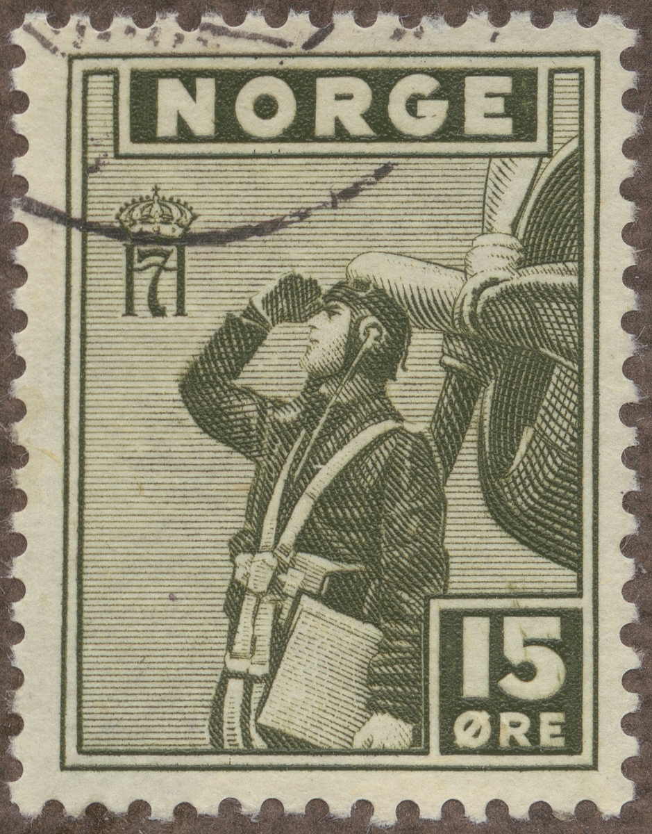 Frimärke från Norge, 1944. Motiv av Norsk fältflygare framför sitt plan