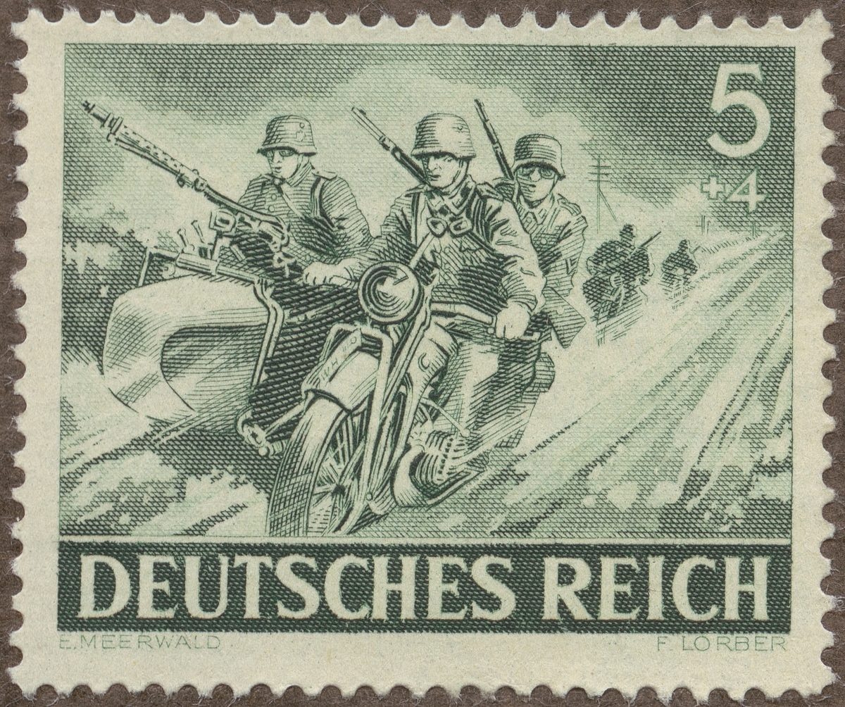 Frimärke från Tyskland, 1943. Motiv av Motorcykel med baksäte och sidovagn i militär tjänst -tysk "Krigshjälte-serie 1943"
