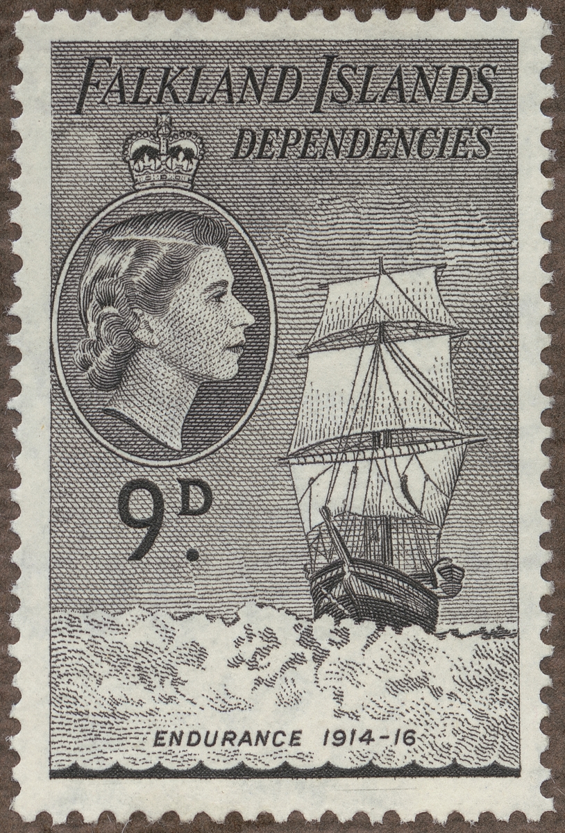Frimärke från Falklandsöarna, 1954. Motiv av "Endurance": Sydpolarfartyg 1914-1916. Sir Ernest Schackleton (eng. -1874-1922). Ned i Weddellhavet för att göra en transantarktisk slädtur. Fartyget fast i isen, krossedes. Räddade först till Elefantön, sedan av ett chilenskt fartyg.