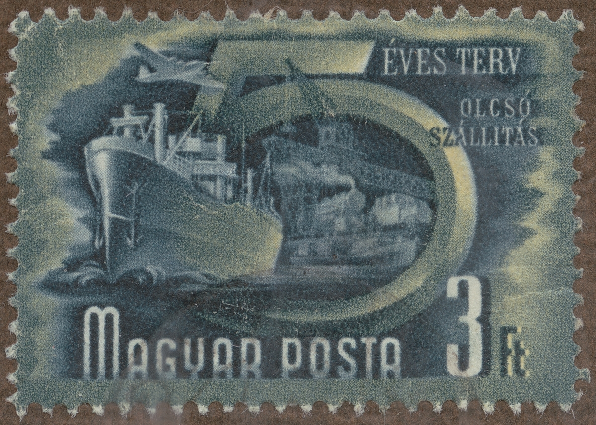Frimärke från Ungern, 1950. Motiv av Ungerskt transportfartyg: "Serie. propaganda för Ungerns 5-års plan."