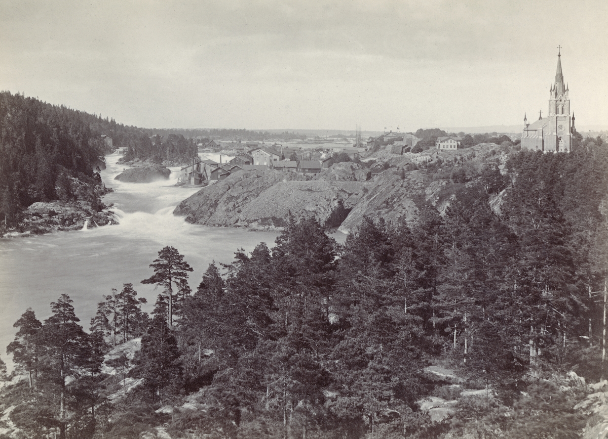 Trollhättan. Göta Älv. Vattenfall med kyrka i bakgrunden.