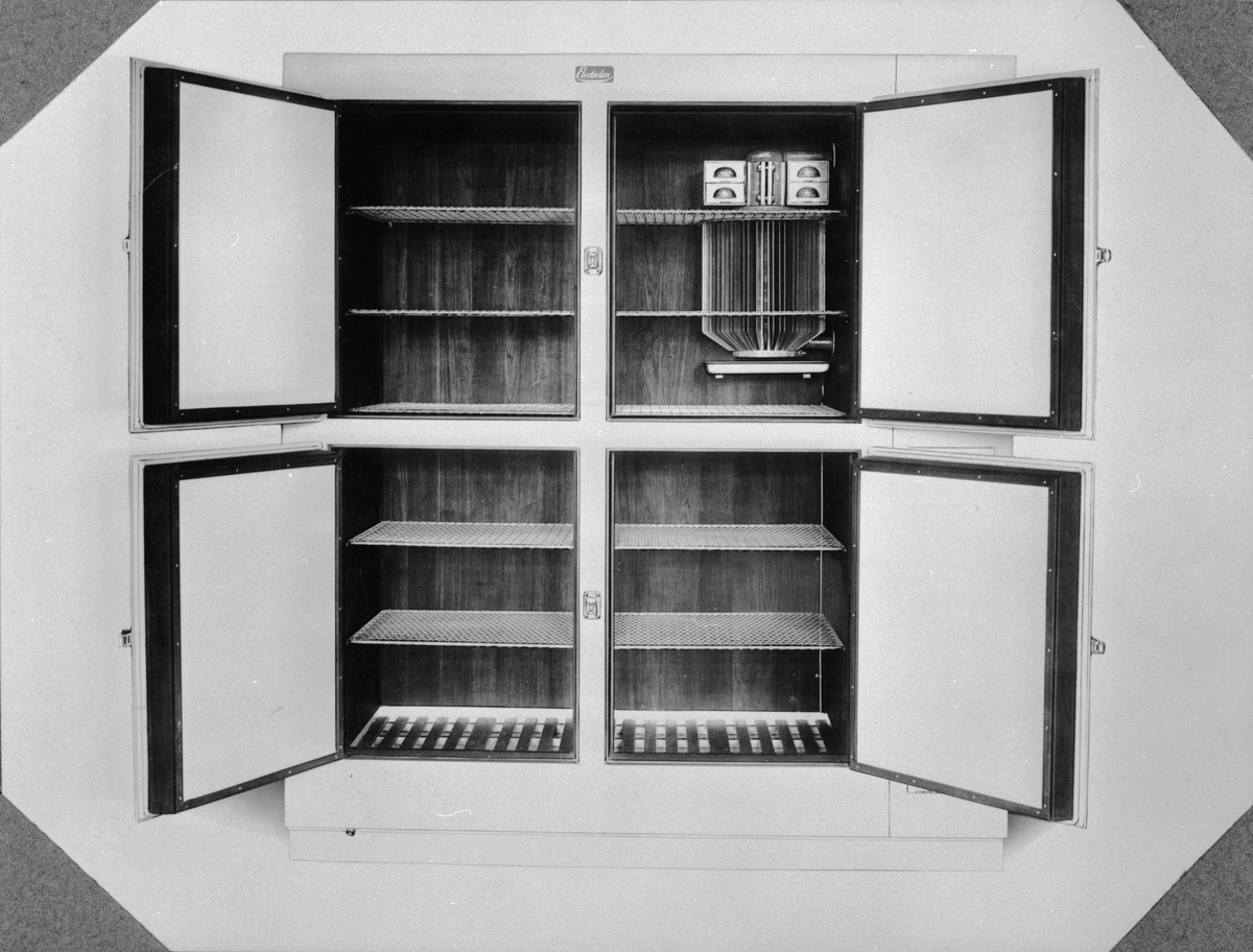 Tecknad. 4 st kylskåp i ett hölje, öppet.