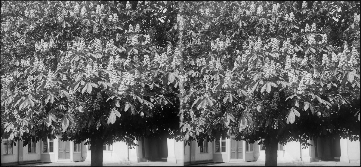 Stereonegativ, blommande kastanjeträd, troligen någonstanns i södra Dalarna.