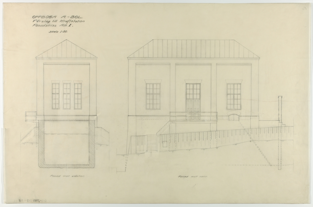 Ritning över Oppboga A. Bol. Förslag till kraftstation. Skala 1:50.