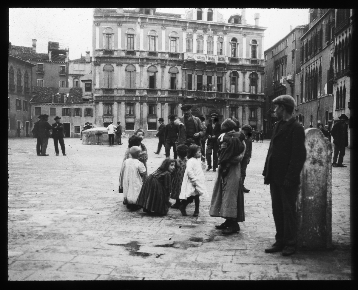 Skioptikonbild från institutionen för fotografi vid Kungliga Tekniska Högskolan. Motiv från ett torg i Venedig. Bilden är troligen tagen av John Hertzberg under en resa i Europa.