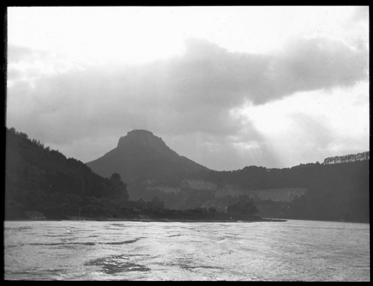 Skioptikonbild från institutionen för fotografi vid Kungliga Tekniska Högskolan. Motiv föreställande en landskapsvy.. Bilden är troligen tagen av John Hertzberg under en resa.