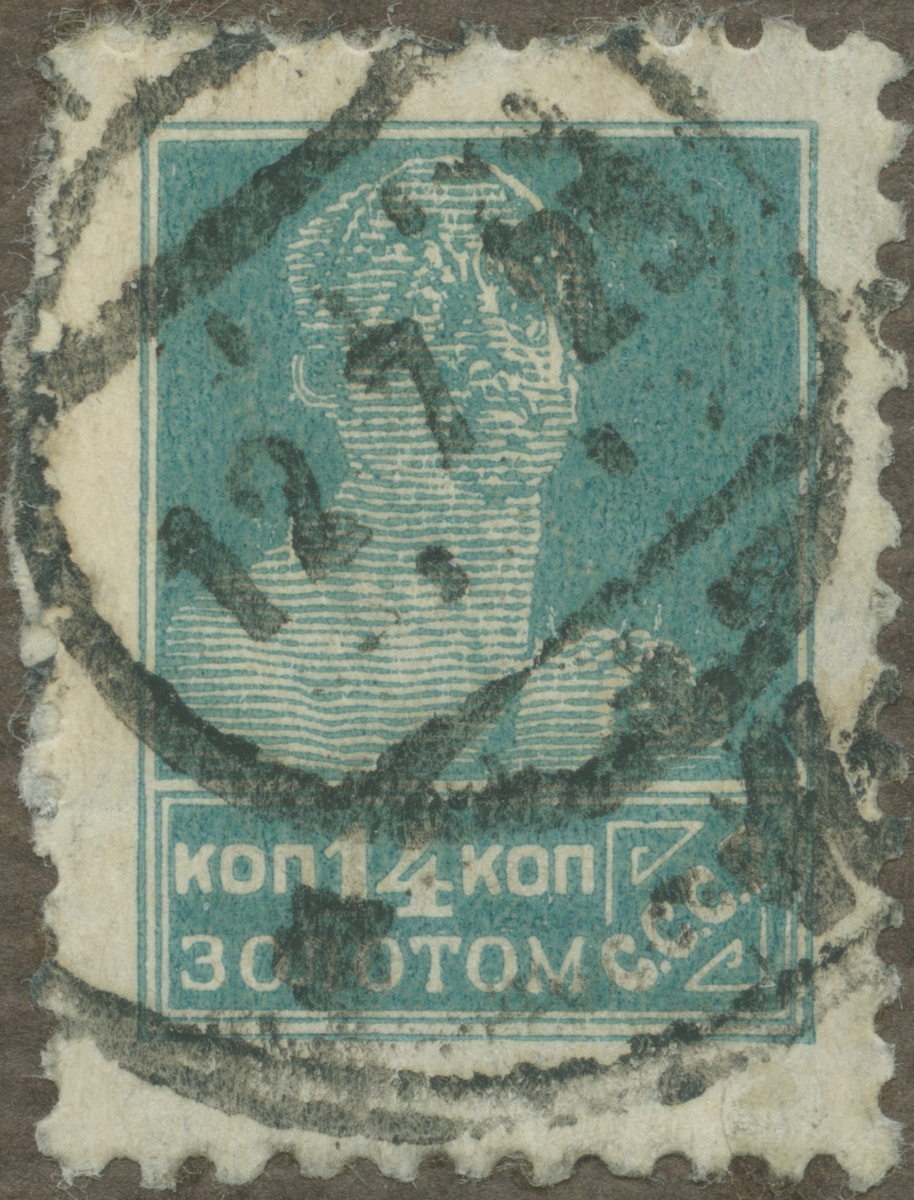 Frimärke ur Gösta Bodmans filatelistiska motivsamling, påbörjad 1950. Frimärke från Ryssland, 1923. Motiv av "manlig arbetare".