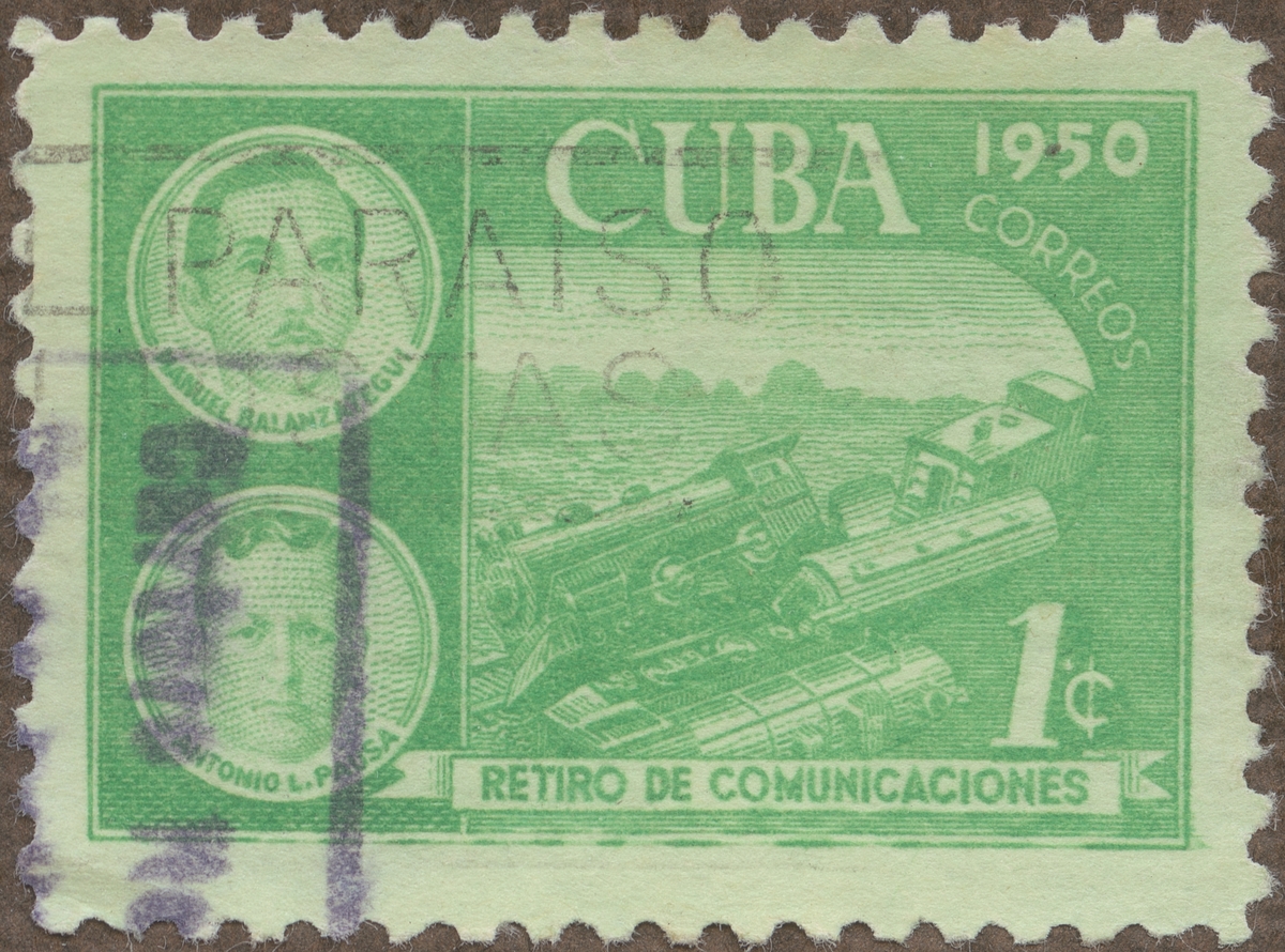 Frimärke ur Gösta Bodmans filatelistiska motivsamling, påbörjad 1950. Frimärke från Cuba, 1950. Motiv av Järnvägsolycka. Manuel Balanzategui och Antonio L. Pausa.-