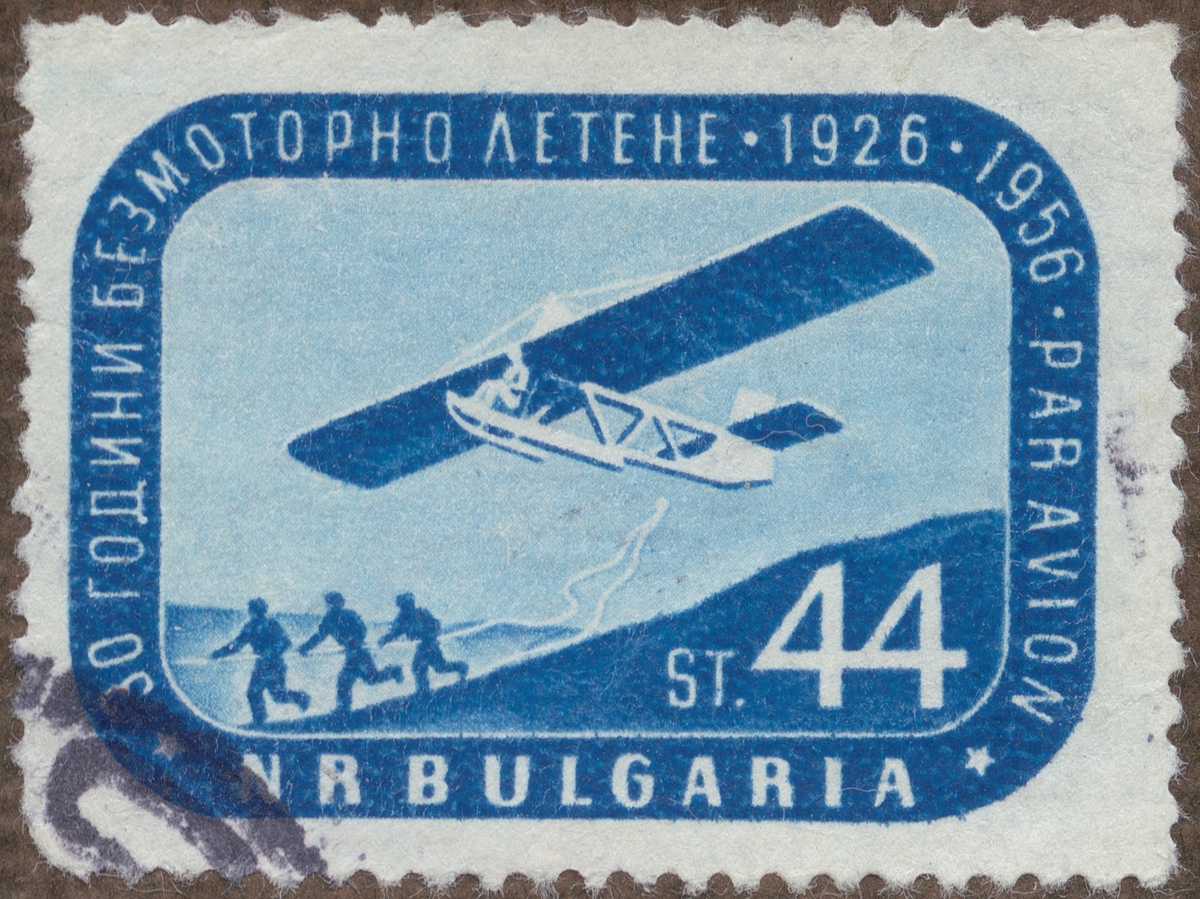 Frimärke från Bulgarien, 1956. Motiv av Monoplan utan motor 30-årsminne 1926-1956