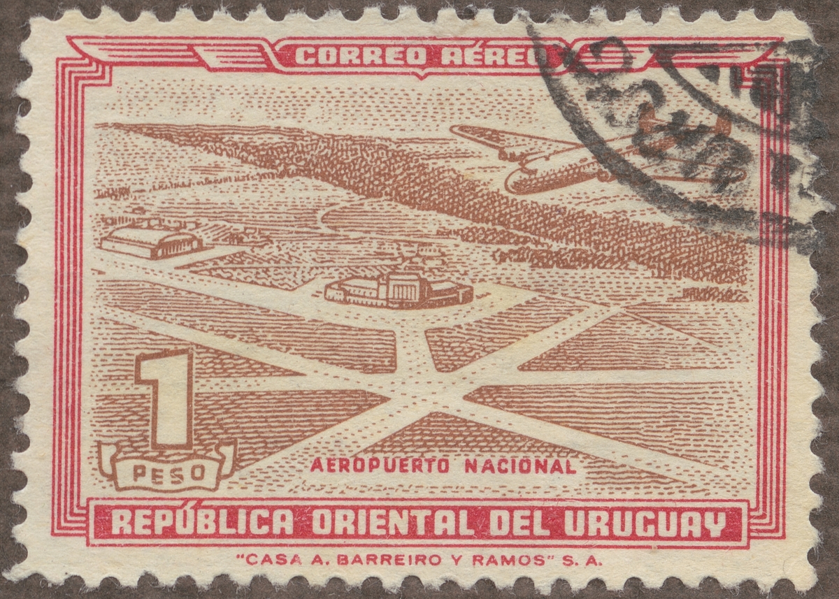 Frimärke från Uruguay,1949. Motiv av Nationalflyghamnen med landningsbanor -Tvåmotorigt monoplan-