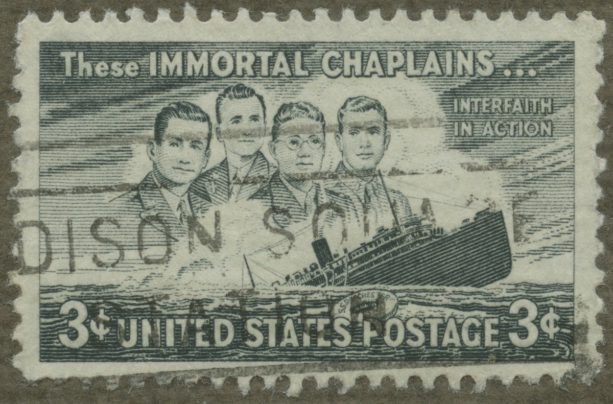 Frimärke från U.S.A., 1948. Motiv av Torpederingen av amerikanska trupptransfartyget S/S Dorchester: 3 februari 1942: världskrig II: -"These immortal chaplains"- Minne av de fyra fältpräster George L. Fox, Clark V. Poling, John P. Washington och Alexander D. Goode vilka omkom vid Dorchester katastrofen därför att de överlämnade sina livräddningsbälten åt fyra soldater.