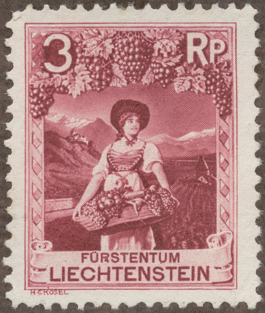 Frimärke från Liechtenstein, 1930. Motiv av flicka med vindruvor.