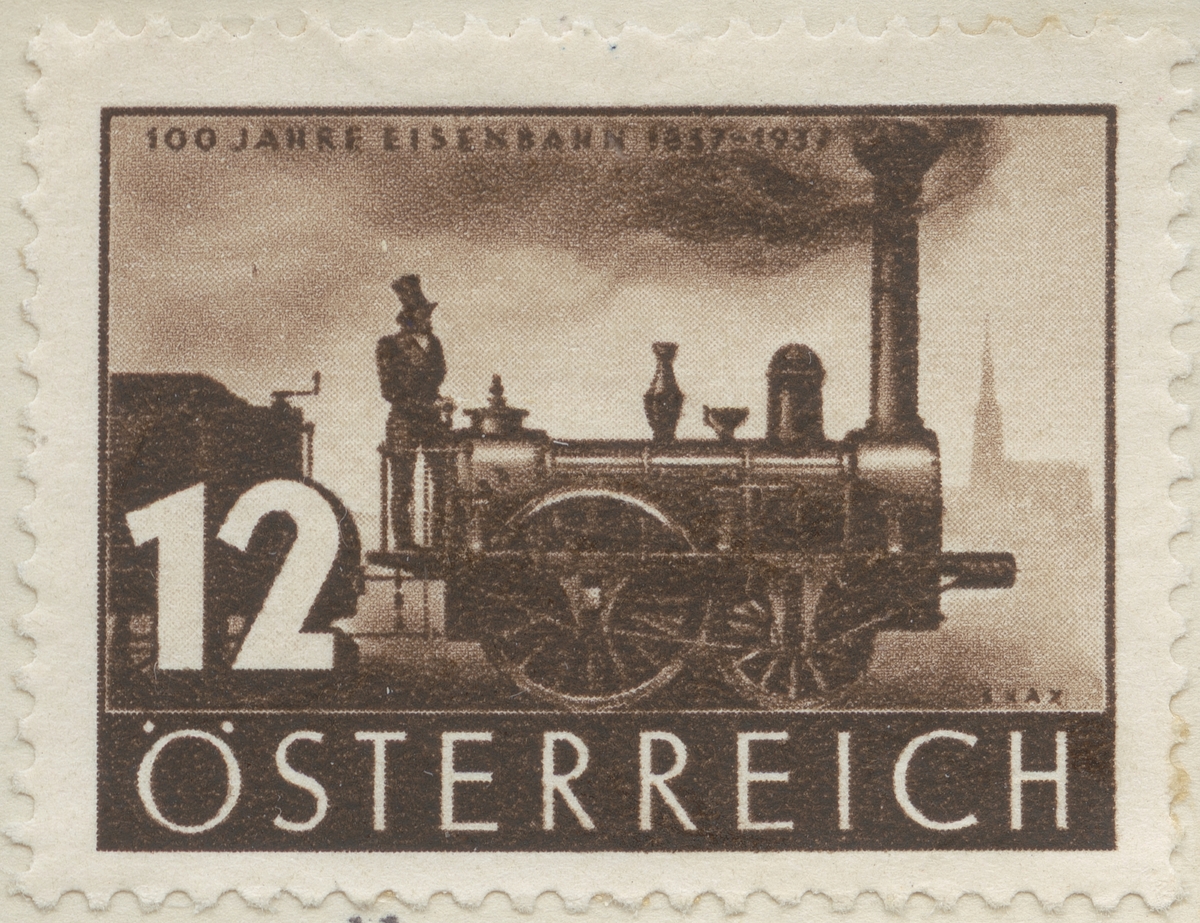 Frimärken ur Gösta Bodmans filatelistiska motivsamling, påbörjad 1950. Frimärke från Österrrike, 1937. Motiv av "Austria": Det första österrrikiska ångloket av år 1837 "Österrikes järnvägars 100-årsjubileum: 1837-1937"