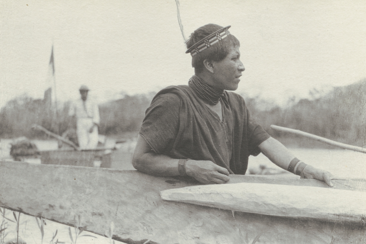 Fotografi från kuvert märkt med "Ernst Nordenskjöld". Motiv av man och kanot vid flod i djungel.