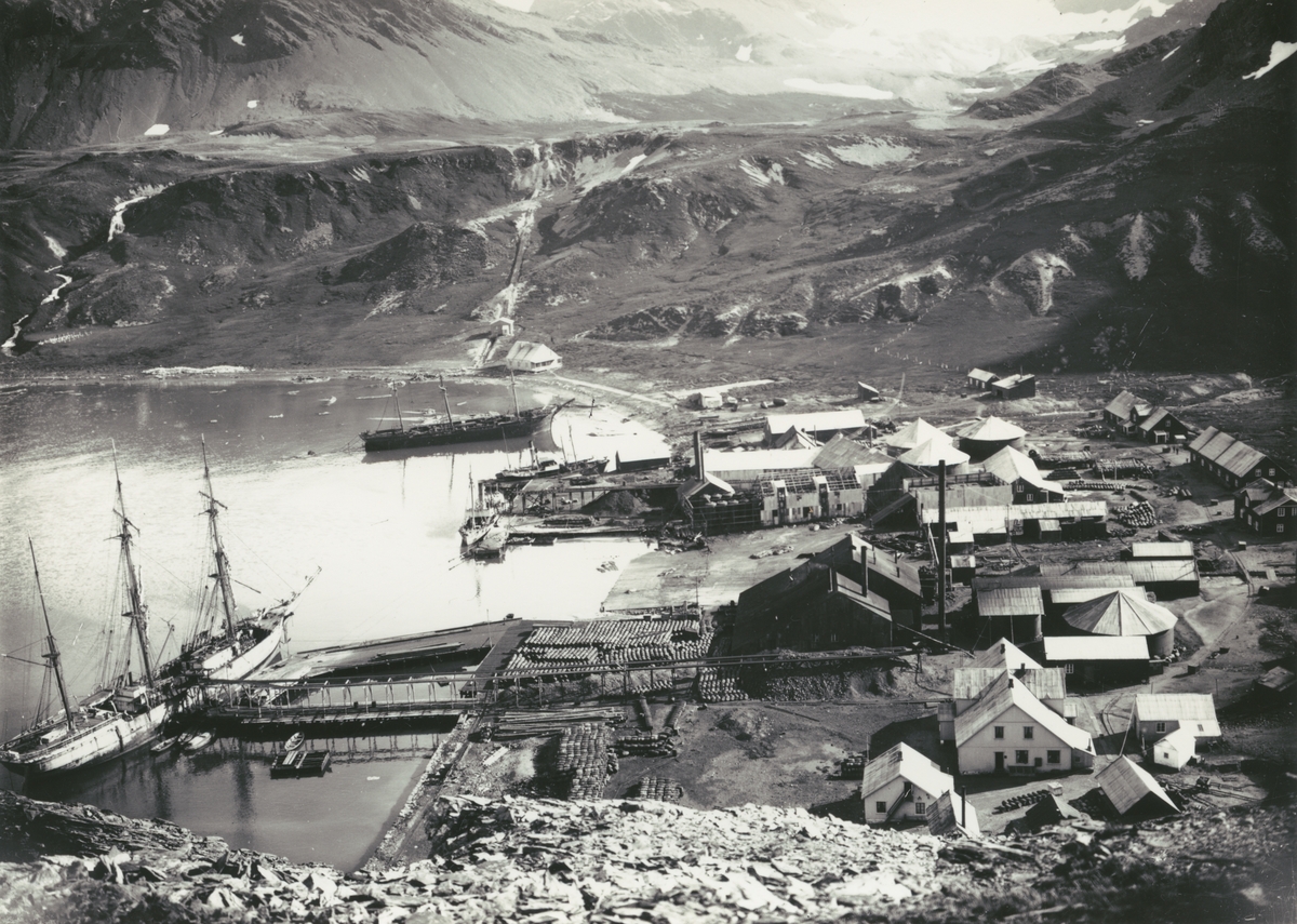 Bild från expedition i Antarktisområdet. Vy över hamn i Grytviken. Till vänster i bilden syns fartyget "Tijuca" och i bakgrunden fartyget "Louise", 1912.