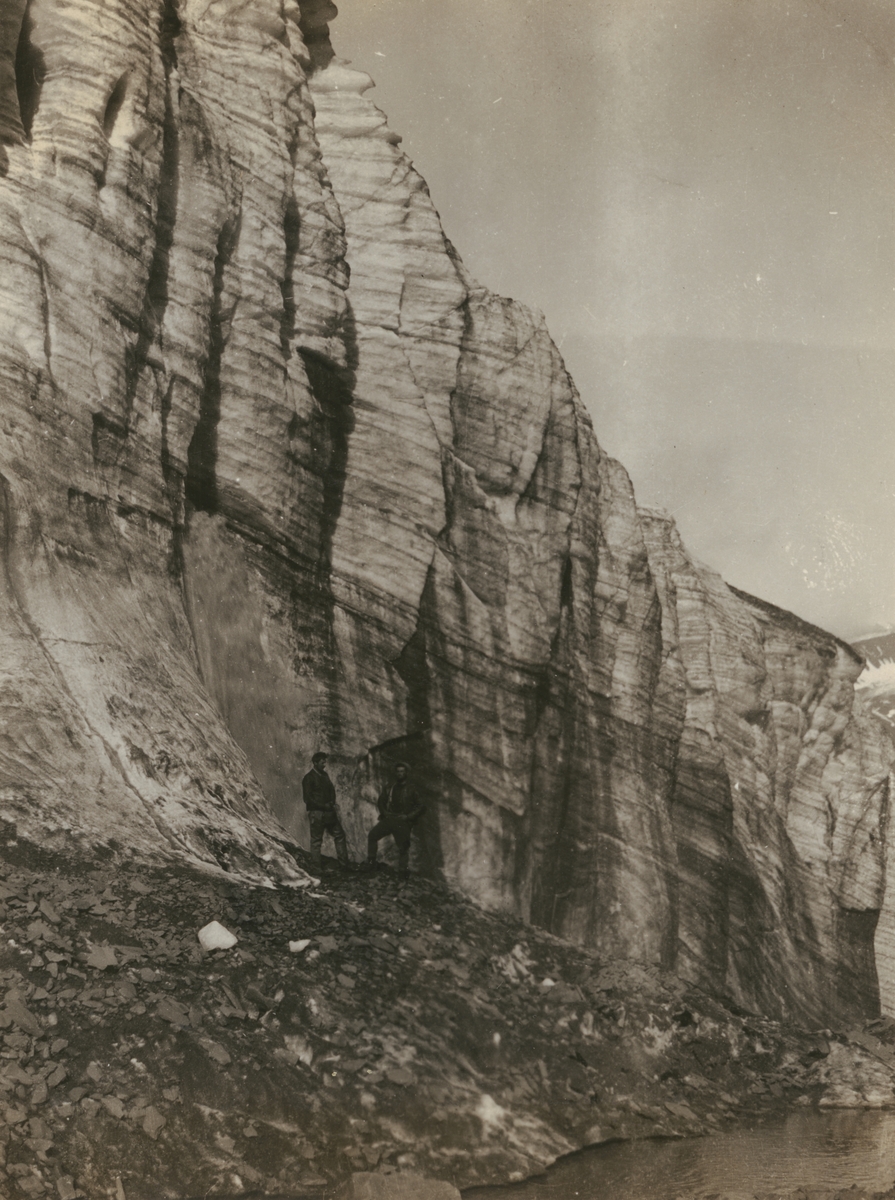 Fotografi från expedition till Sveagruvan. Motiv av två män som står nedanför ett berg.