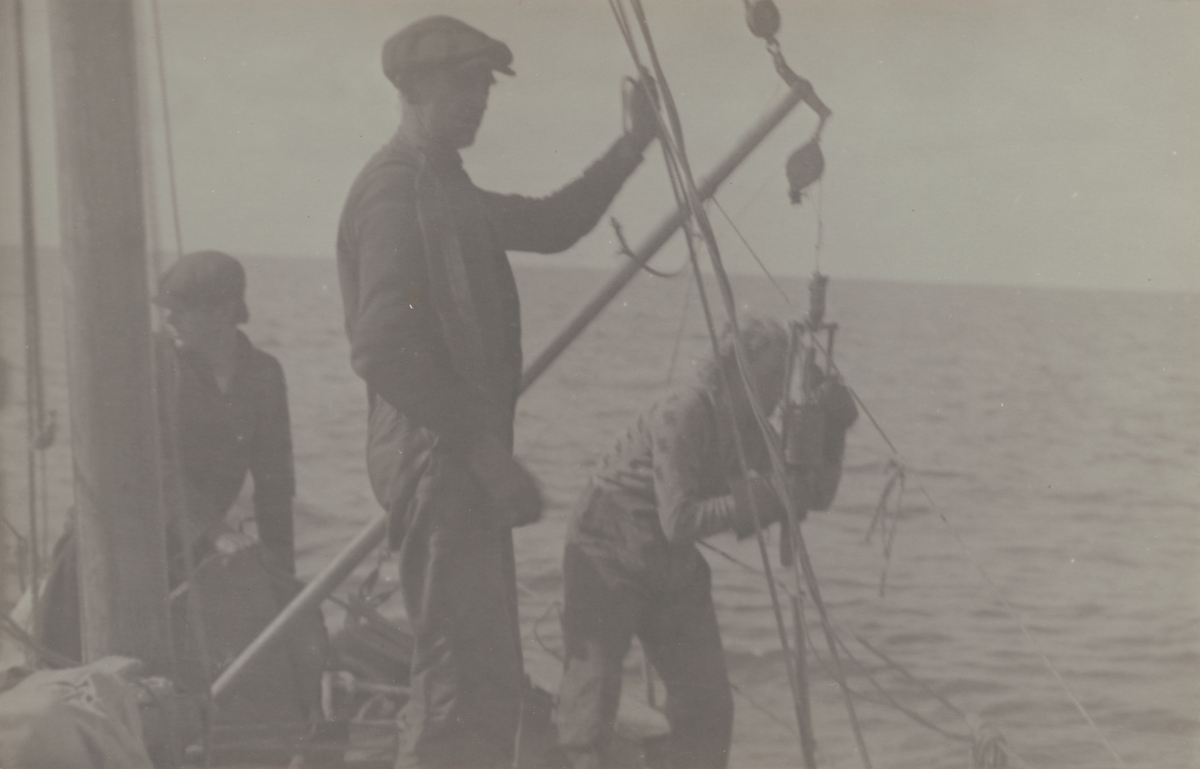 Diverse bilder ur Fred Goldbergs samling. Motiv av tre besättningsmän på fartyg.
