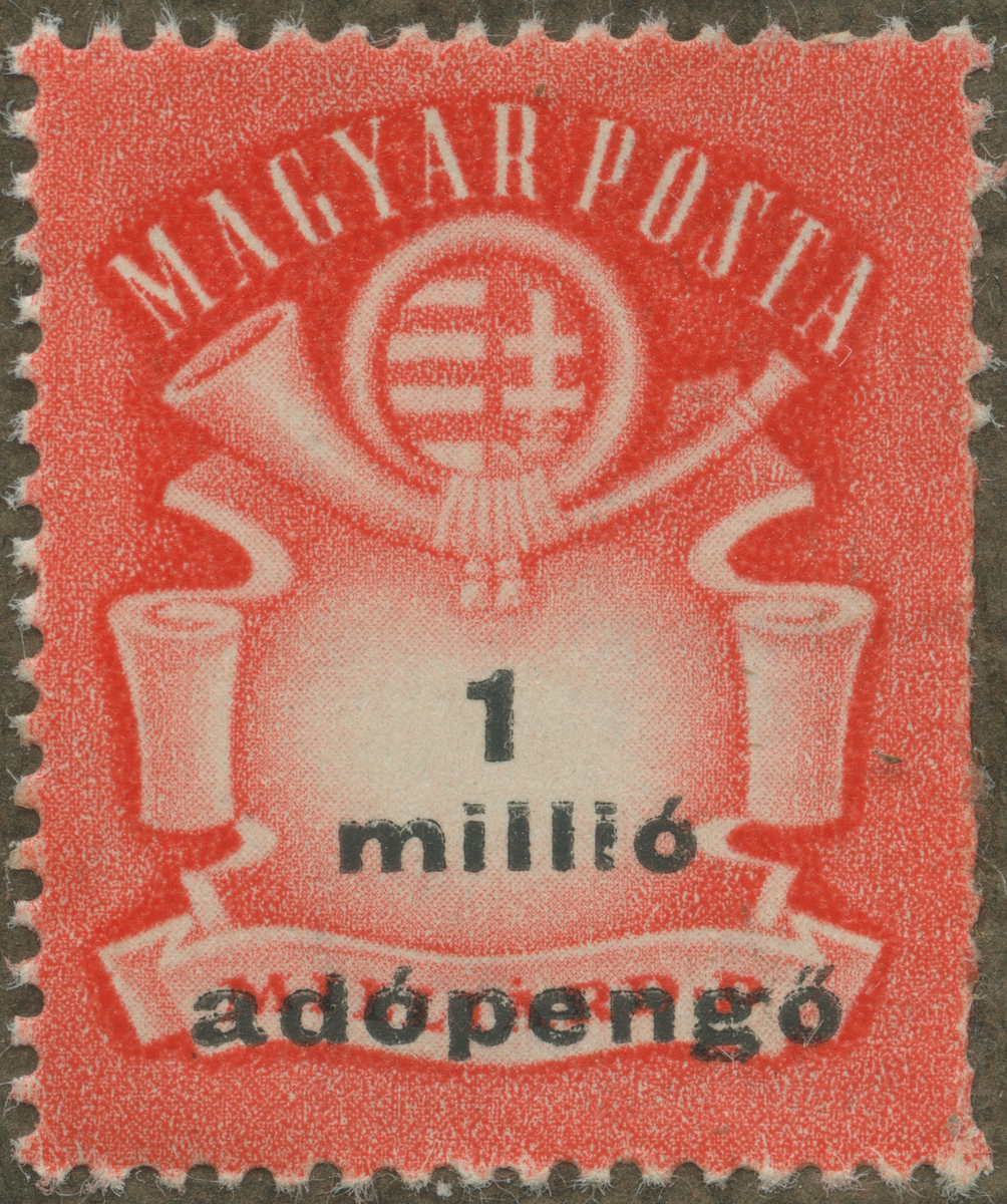Frimärke från Ungern, 1946. Motiv av Ungerns vapen i posthorn. " 1 millió adópengö" = 1 million adópengö (fluktuerande valuta)