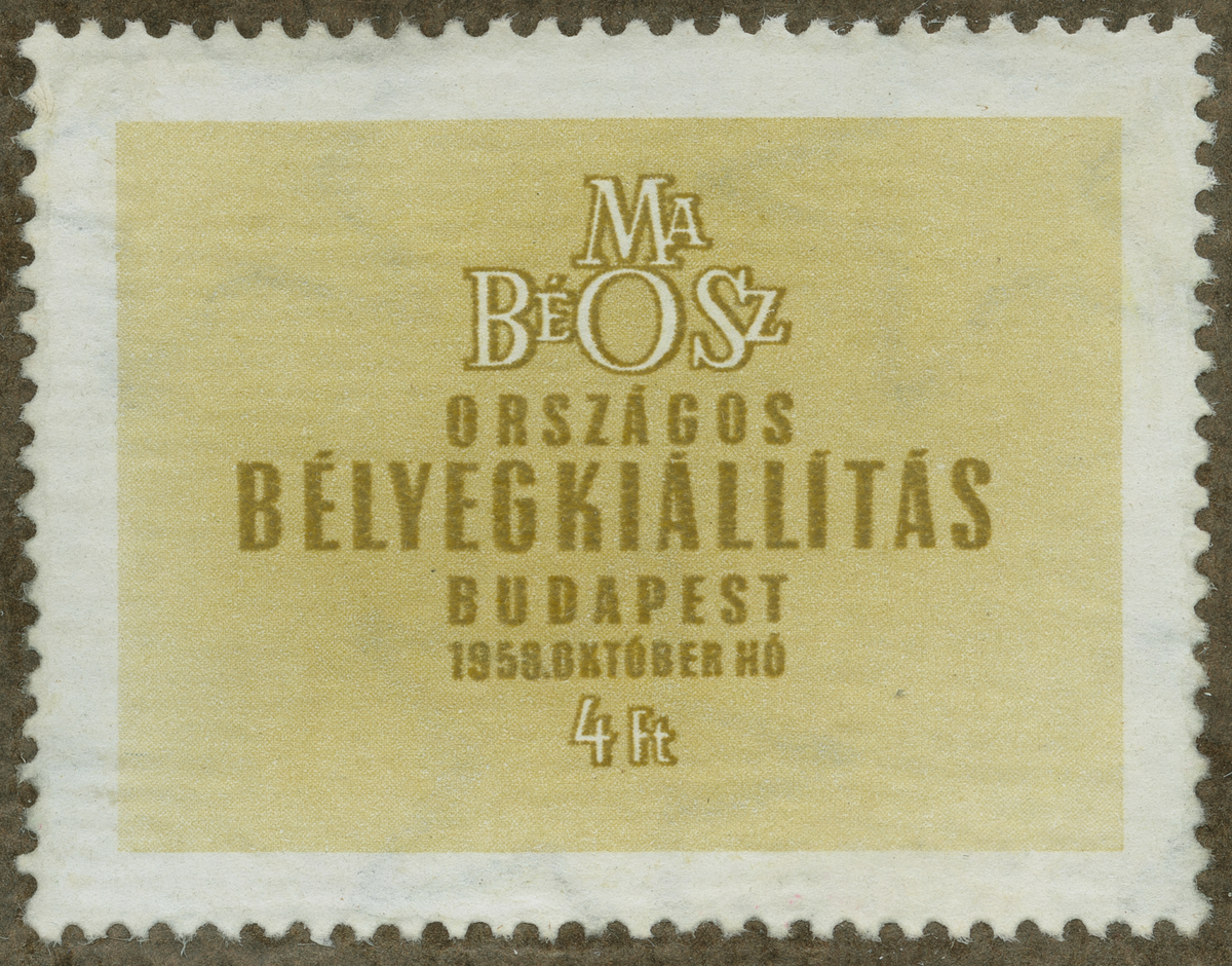 Frimärke från Ungern, 1958. Motiv av Inskriptioner Oktober 1958 National ungersk frimärksutställning i Budapest, Oktober, 1958.