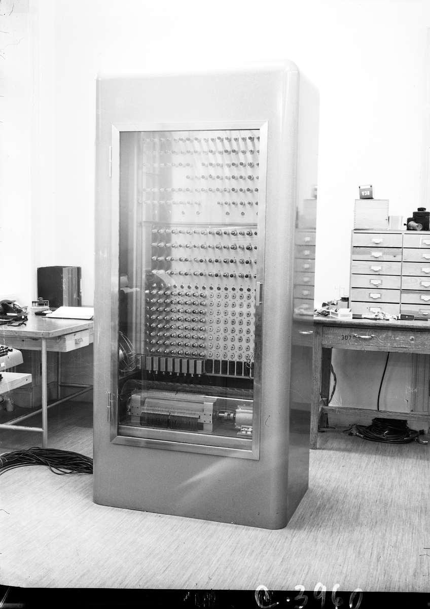 Dokumentation av byggandet av matematikmaskinen BESK på Drottninggatan i Stockholm. Trumminnet monterat i botten på stativet.