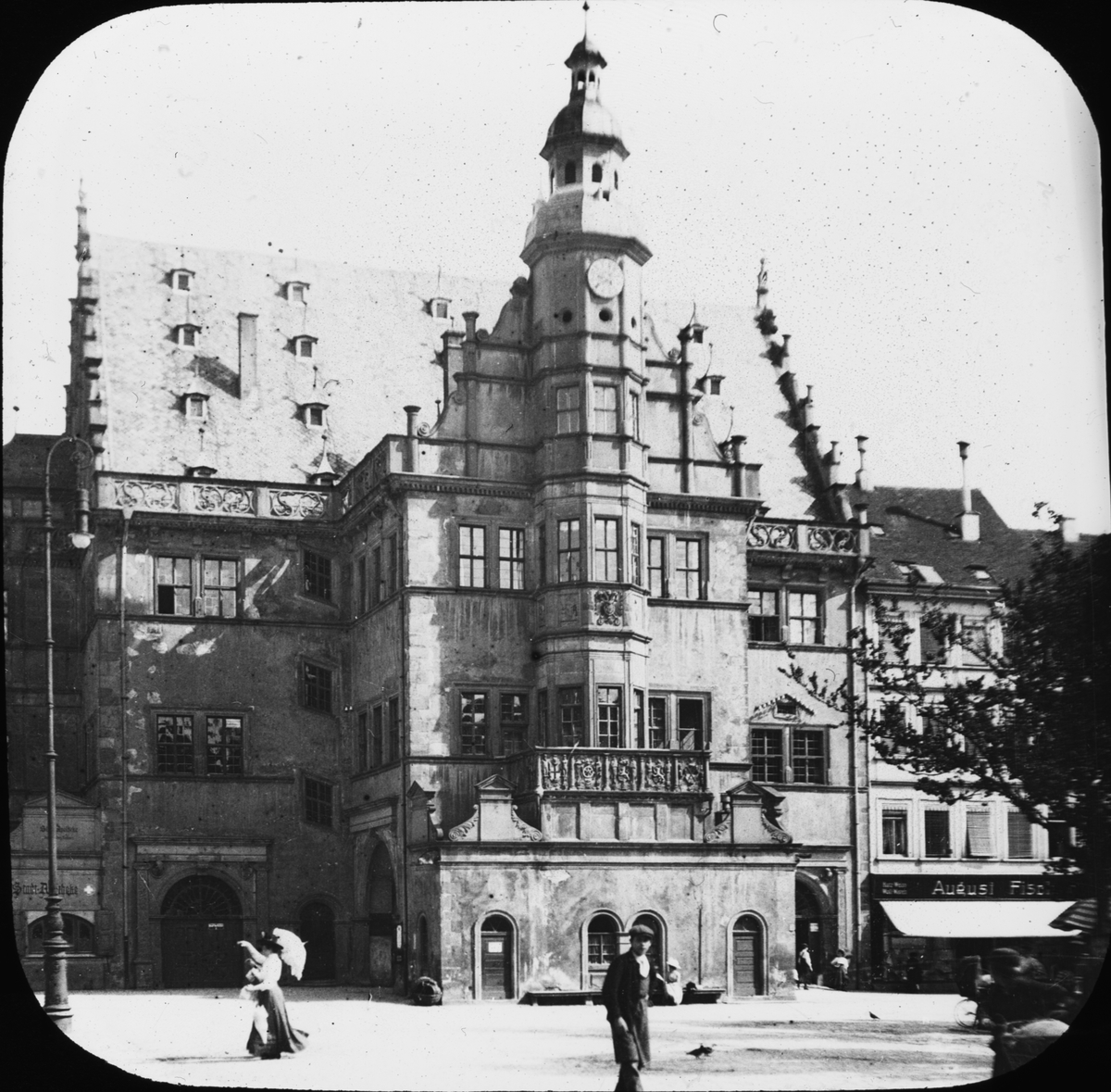 Skioptikonbild med motiv av rådhuset i Schweinfurt, Rathaus Schweinfurt.