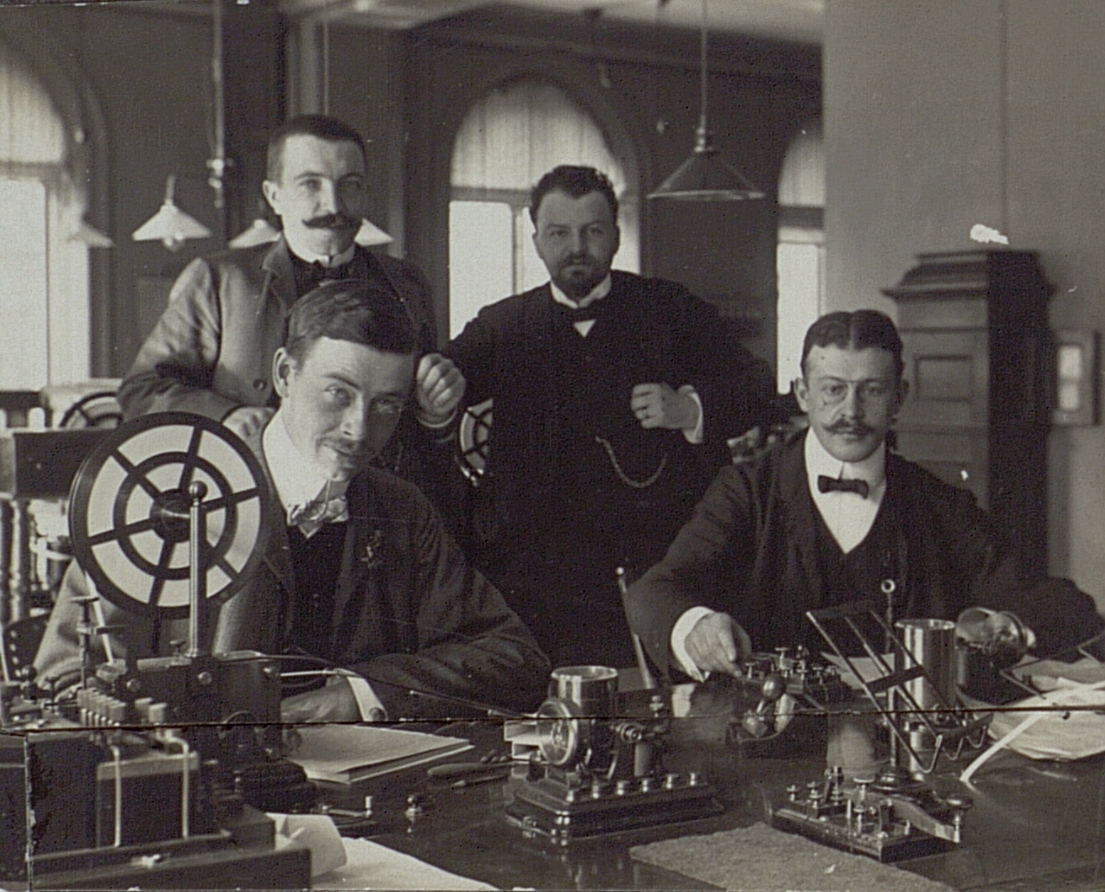 Sundsvall. Telegrafstationen. Interiörbild. Stående: Wiegandt och Gla. Sittande: Uhnberg och Liebermann.