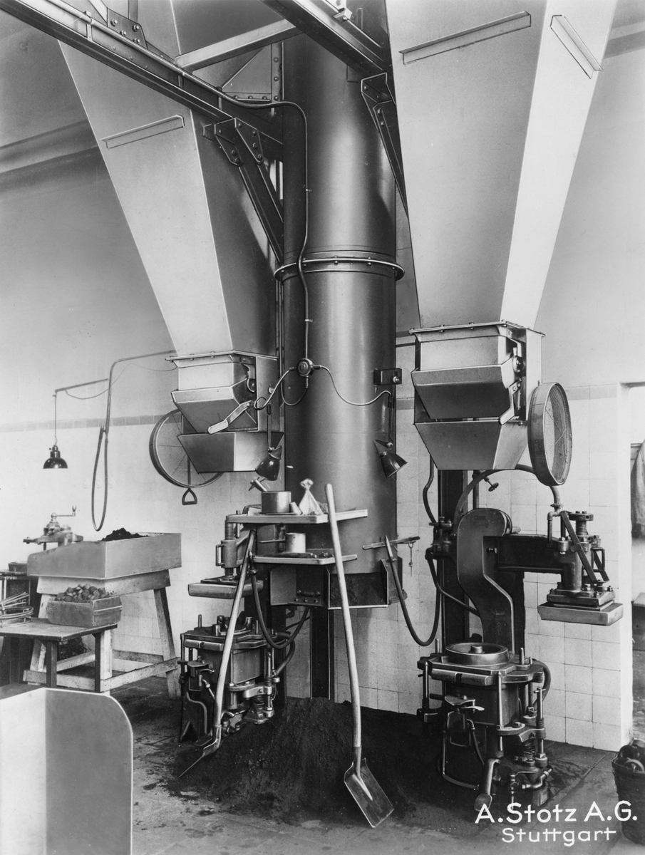 Gjutgodsbehållare och tilledning för gjutsand. Ensamförsäljare: Maskin AB Karlebo, Stockholm.