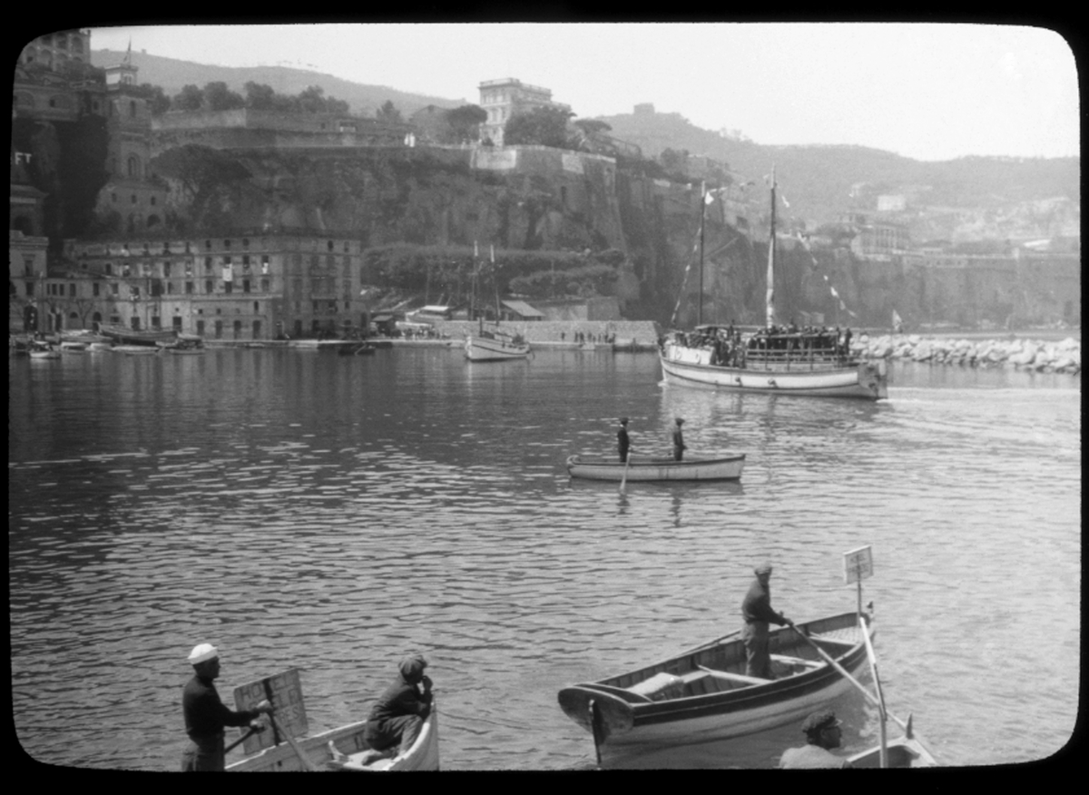 Titel: Skioptikonbild från institutionen för fotografi vid Kungliga Tekniska Högskolan. Motiv föresällande roddbåtar med passagerare utanför en bergssluttning, sannolikt nära Neapel i Italien. Bilden är troligen tagen av John Hertzberg under en resa i Europa.