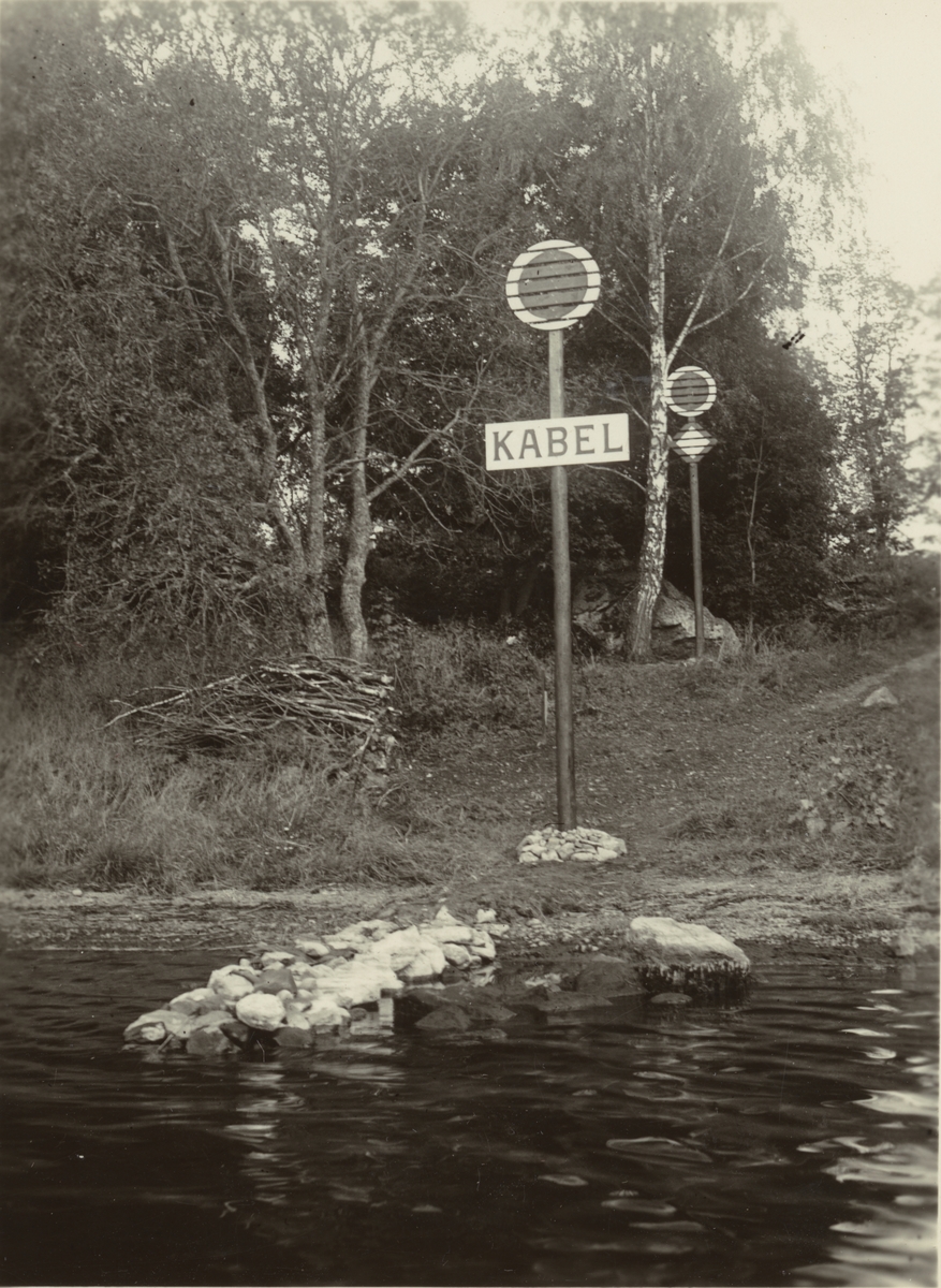 Finnvikskabeln. Kabelbåkar och kabelmärke vid Björnö. Ur albumet Kabelarbetet Hjälmsälra (Hjälmsättra) - Norrtälje - Finnviken utfört under sommaren 1928.