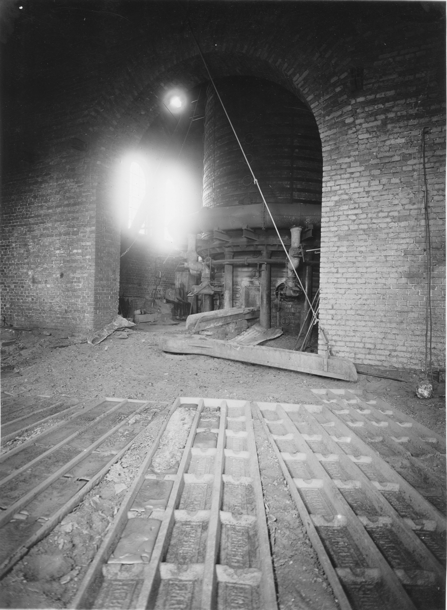 Herrängs järnverk. Masugnen. Galtsängar, tackor märkta "Herräng". Omkring 1910.