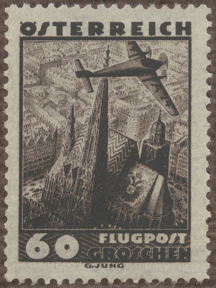 Frimärke från Österrike, 1935. Motiv av Österrikiskt monoplan över kyrkan S:t Etienne