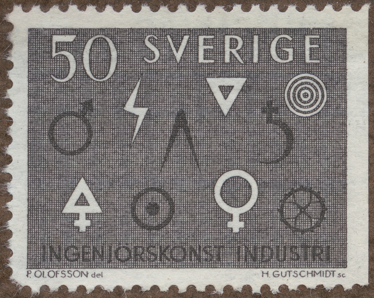Frimärke från Sverige, 1963. Motiv av Kugghjulet och andra 3000-år gamla symboler för svensk industri och ingeiörskonst. Kugghjulet med de kluvna ekrarna erinrar om den mekaniska verkstadsindustrien.